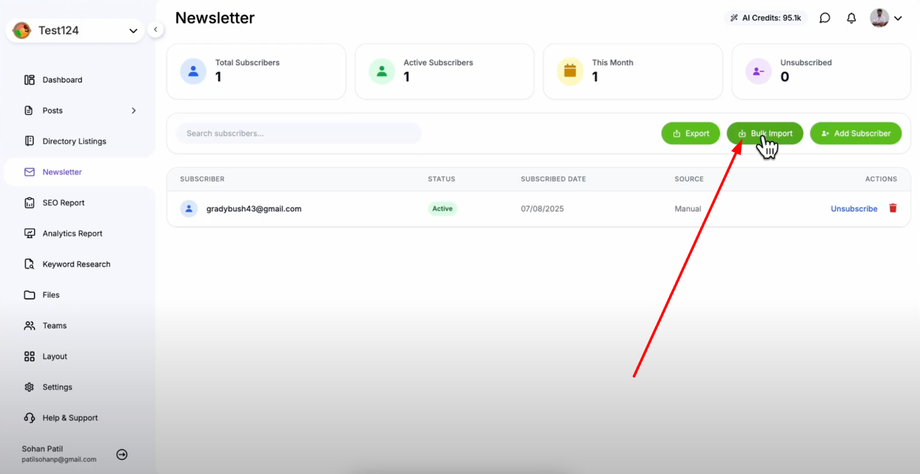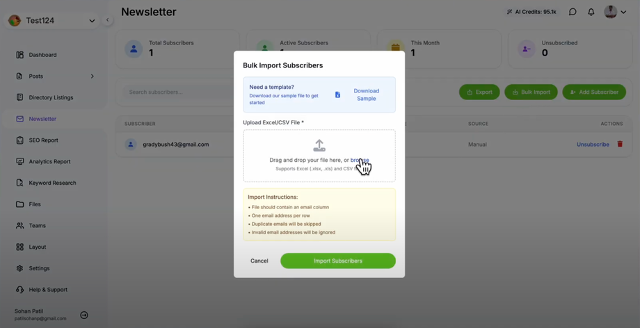 Click on the "Bulk Import" option to access the file upload interface. Upload your CSV or Excel file containing subscriber email addresses by selecting it from your computer.