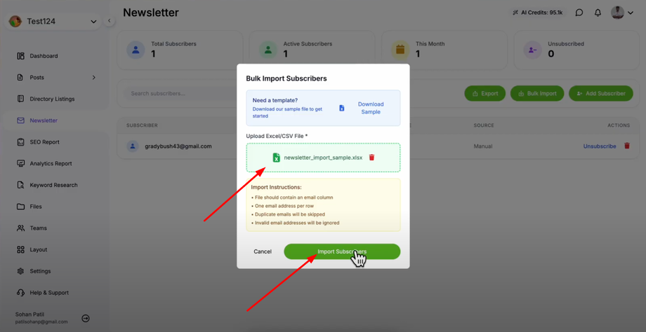 After selecting your file, click the "Import Subscribers" button to begin the processing. All subscribers from your uploaded list will be instantly added to your newsletter system, making it easy to migrate large subscriber lists efficiently.