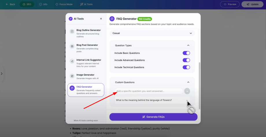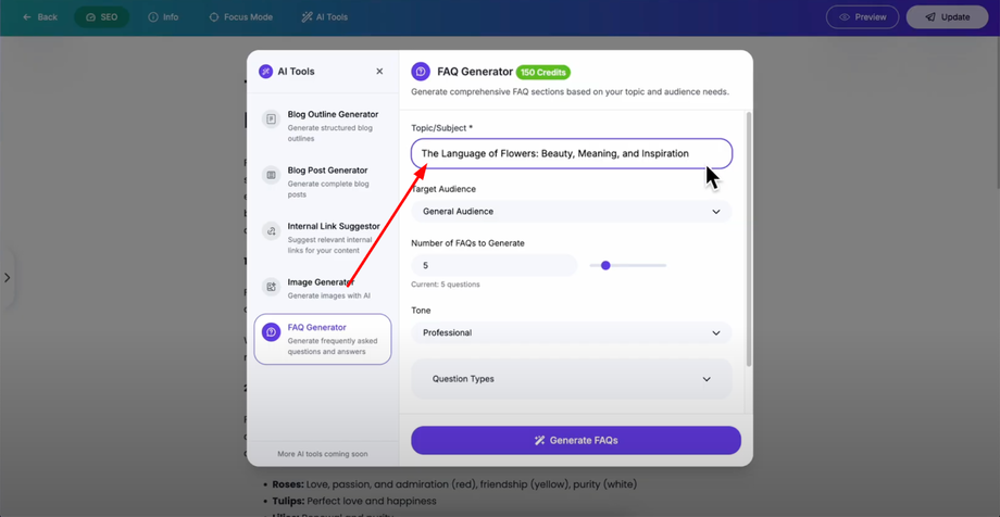Your blog post title is already populated in the field when you open the FAQ generator. This helps the AI understand what your content is about, but you can modify this title if needed or keep it as is for accurate question generation.