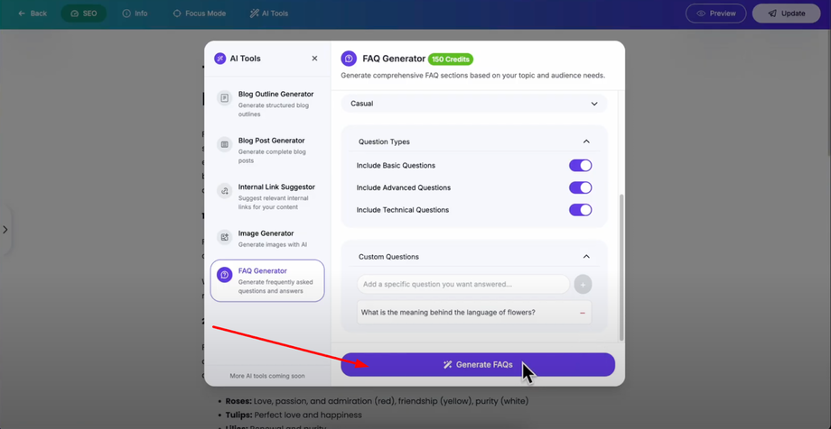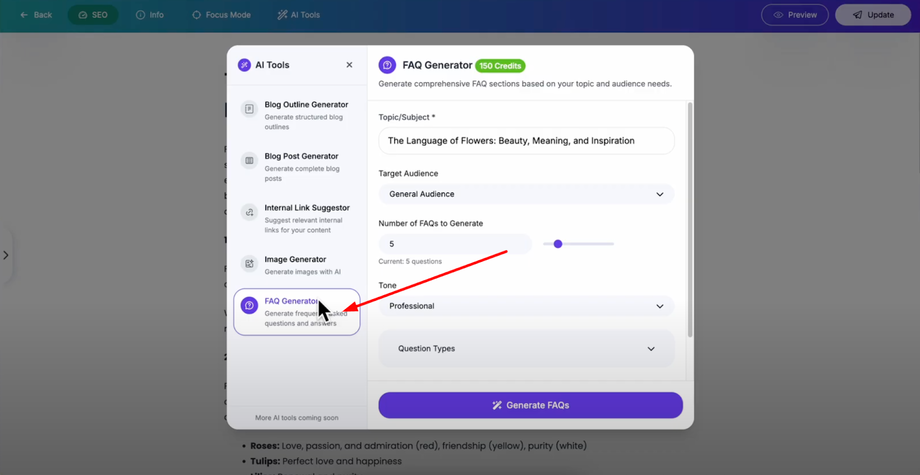 Click on it to access all available AI tools, then select the "FAQ Generator" from the list. This powerful tool helps you create relevant, frequently asked questions and answers based on your blog content.