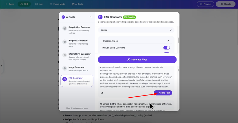 After generation, you'll see professionally crafted FAQs with both questions and detailed answers. You have several options for adding them to your post: