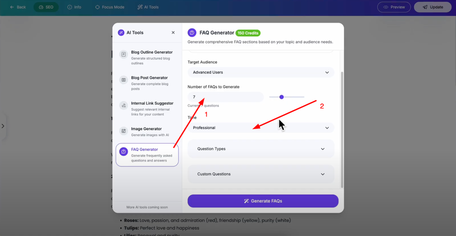 Set the number of FAQs you want to generate by choosing the number that best fits your content length and coverage needs. Select the tone that matches your brand voice and content style to ensure the generated FAQs maintain consistency with your overall content approach.