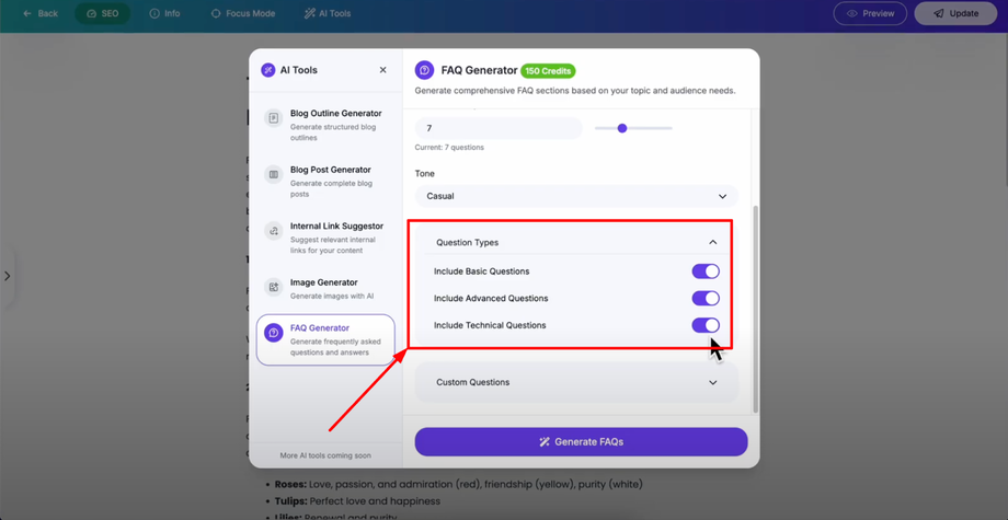 The FAQ generator offers flexible question type options that you can toggle on or off based on your needs: