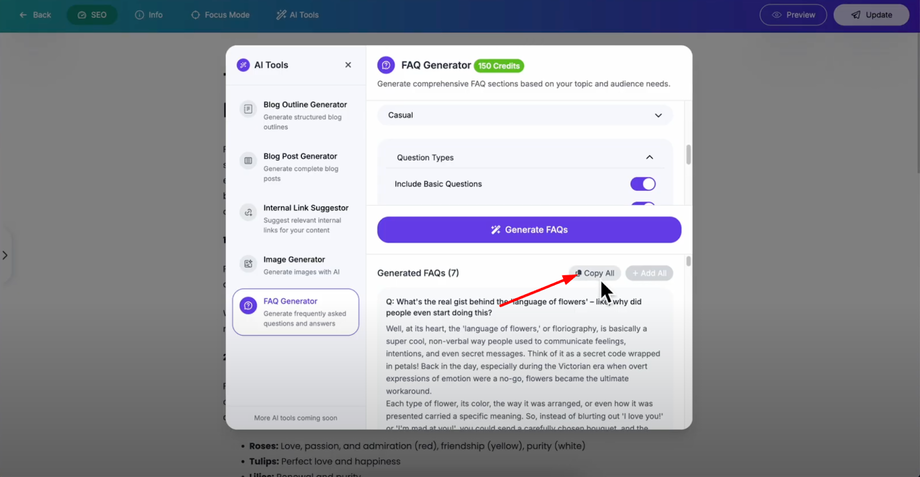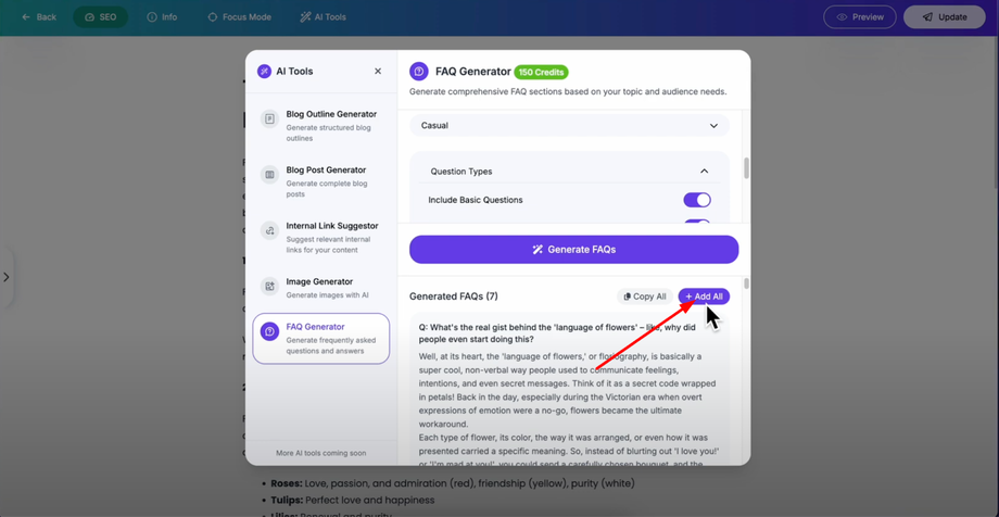 Add All: Use this button to automatically insert all generated FAQs into your blog post at once for faster implementation.