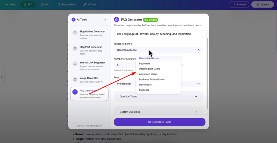 Select your target audience from the dropdown menu to choose the audience that best matches who you're writing for. This helps the AI generate questions that are appropriate for your specific audience level and knowledge base.
