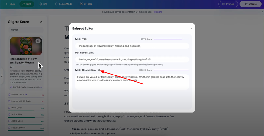 For faster and more efficient meta description creation, Grigora includes an AI meta description generator. Click the "AI Generate" button next to the meta description field to activate the automated generation feature.