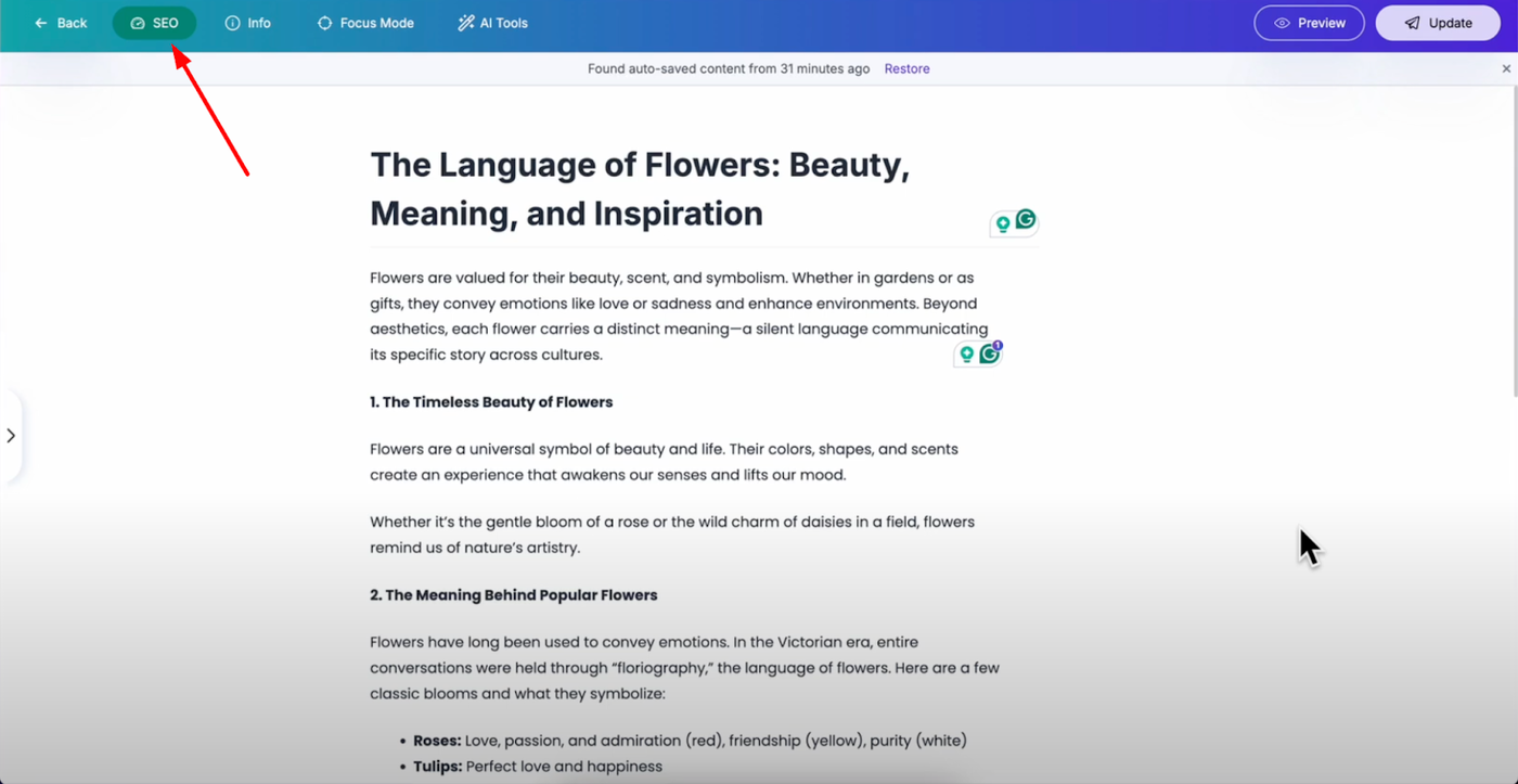 Open your post editor in Grigora and look at the top bar where you'll find the SEO option.