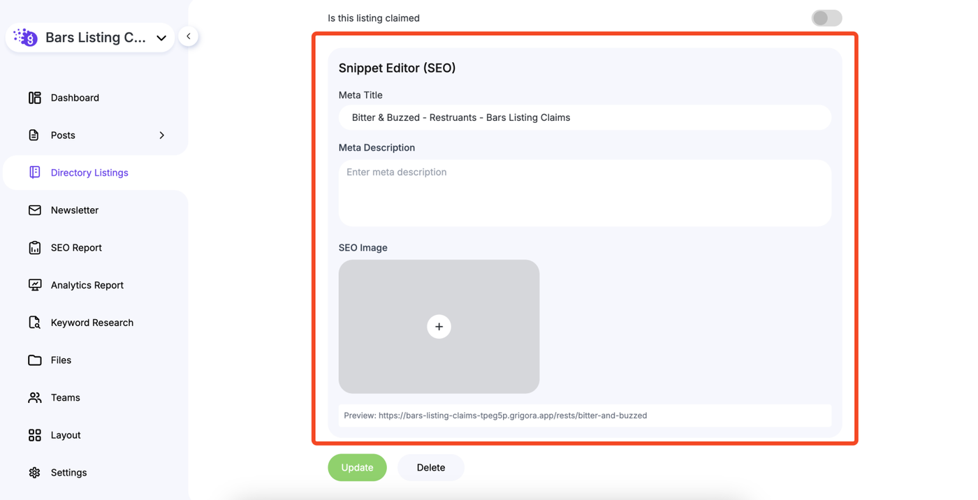 Grigora allows you to optimize each of your directory listings for search engines, helping you improve your visibility and drive more organic traffic. This guide will show you how to customize the SEO snippet for any directory listing.