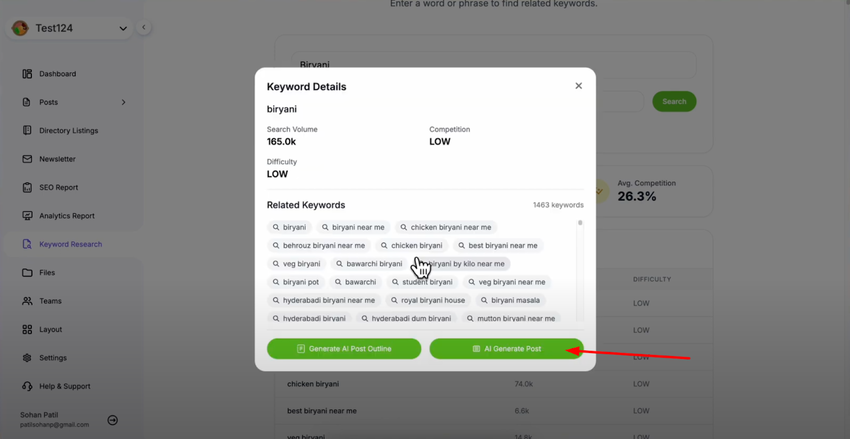 Generate AI Post: Click this to create a complete blog article around the keyword. This opens a separate page where you can generate full blog content that's optimized for your target keywords.