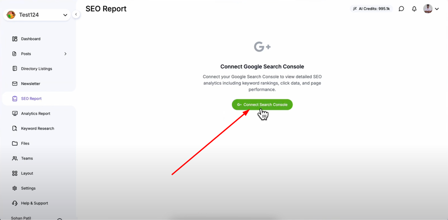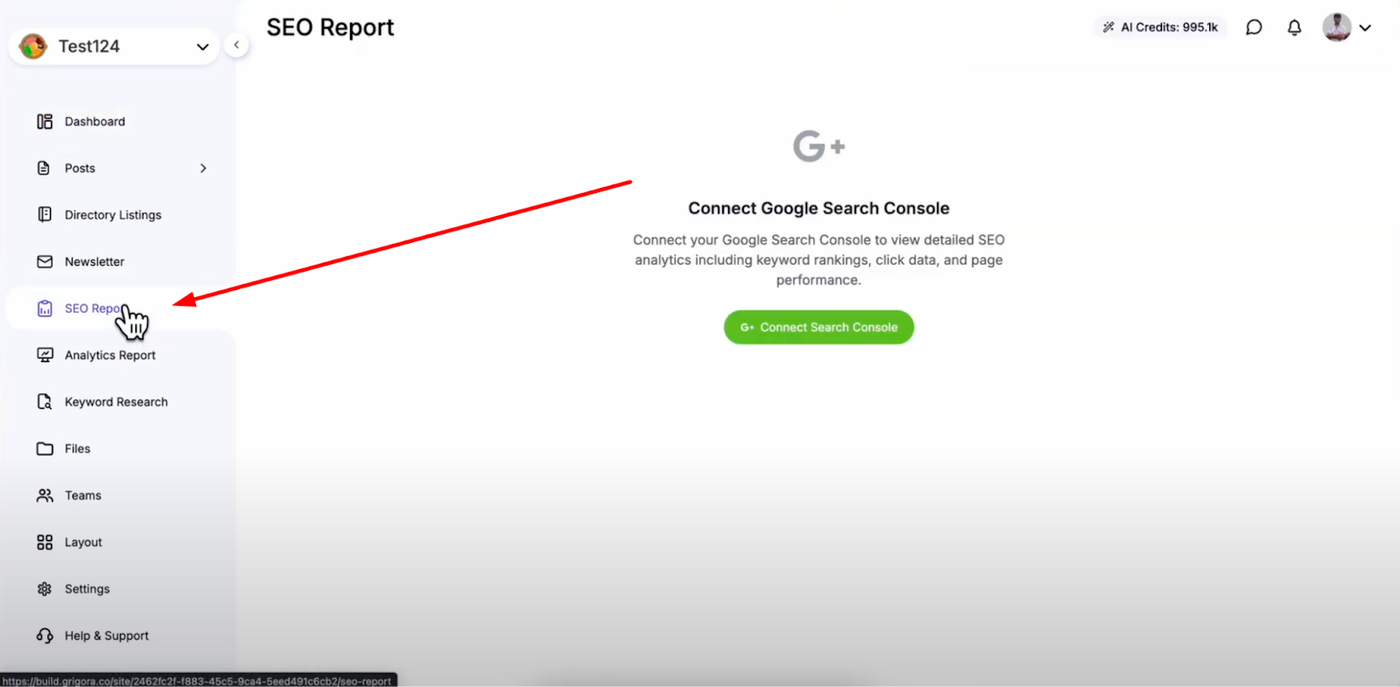 Navigate to your Grigora dashboard and click on "SEO Reports" in the left panel to access the SEO analytics integration section where you can connect your Google Search Console account.