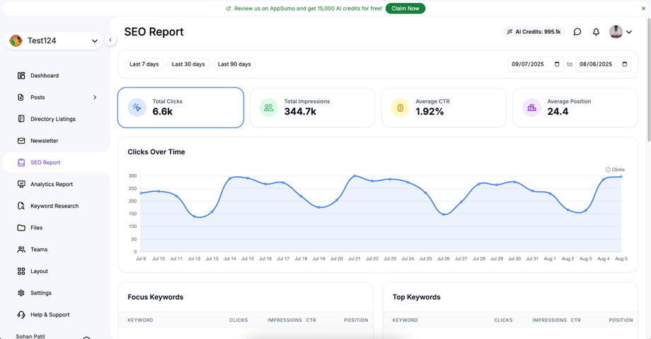 Once connected, you can monitor key analytics including total clicks and impressions, average CTR and position, clicks over time, focus keywords, top performing keywords, page rankings, and other key metrics. This comprehensive data helps you understand which content performs best in search results.