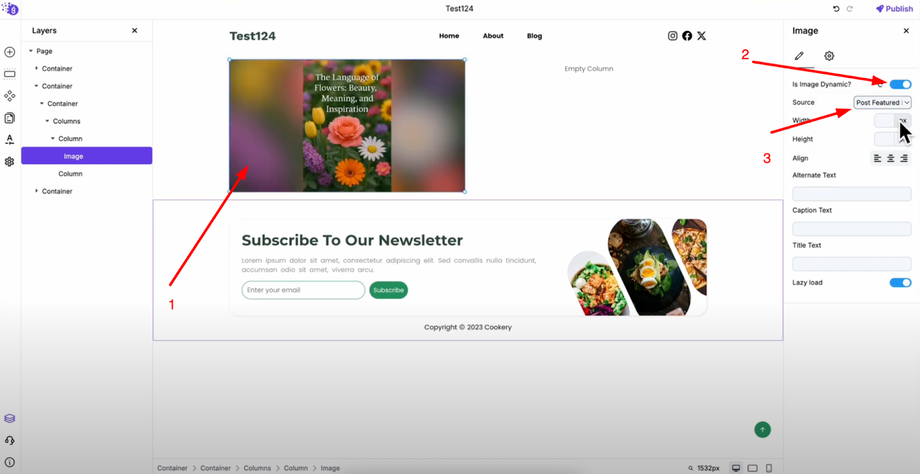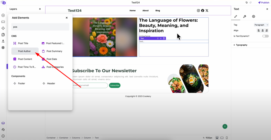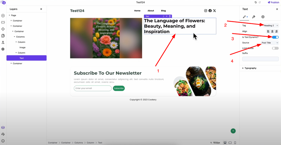 Add a text block to the right column for the post title. Enable "Is Text Dynamic" in settings and select "Post Title" from dynamic field options. Change the tag to H2 for proper heading hierarchy.