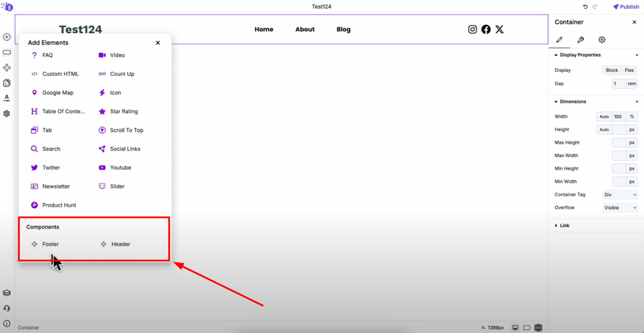 Add your header and footer component from "Add Elements" or copy it from another page to maintain consistent site branding.