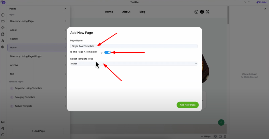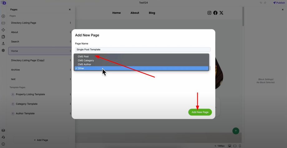 Click "Add Page" in the pages section and enter "Single Post Template" as the page name. Toggle on "Is this page a template" option and select "CMS Post" from the template type dropdown. Click "Add New Page" to create your template foundation.