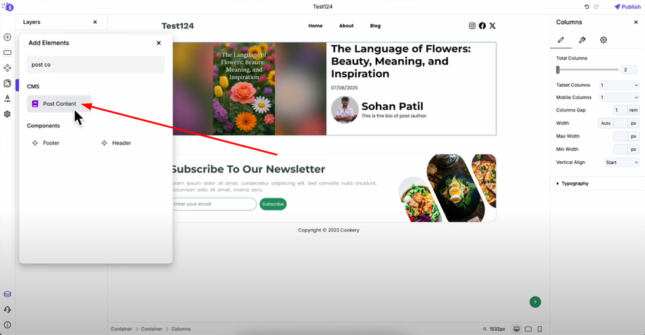 Add post content below your columns by searching for "Post Content" and dragging the block to display the complete blog post content dynamically.