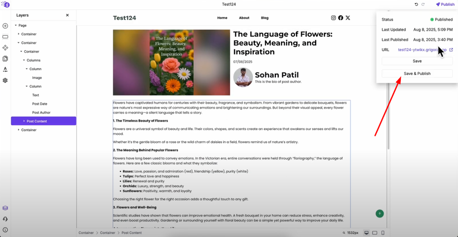 Click "Save and Publish" to apply changes to all blog posts. Your custom template will automatically apply to all blog posts on your website, creating a consistent and professional presentation for individual post pages.