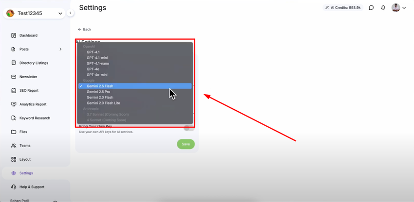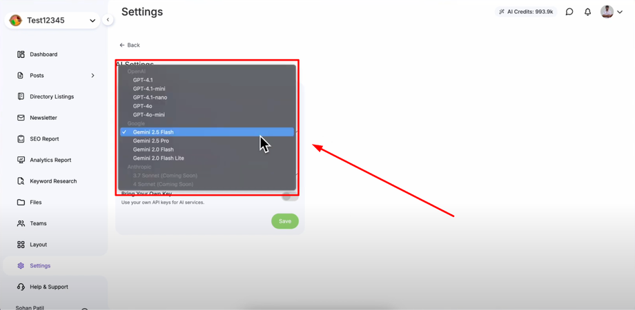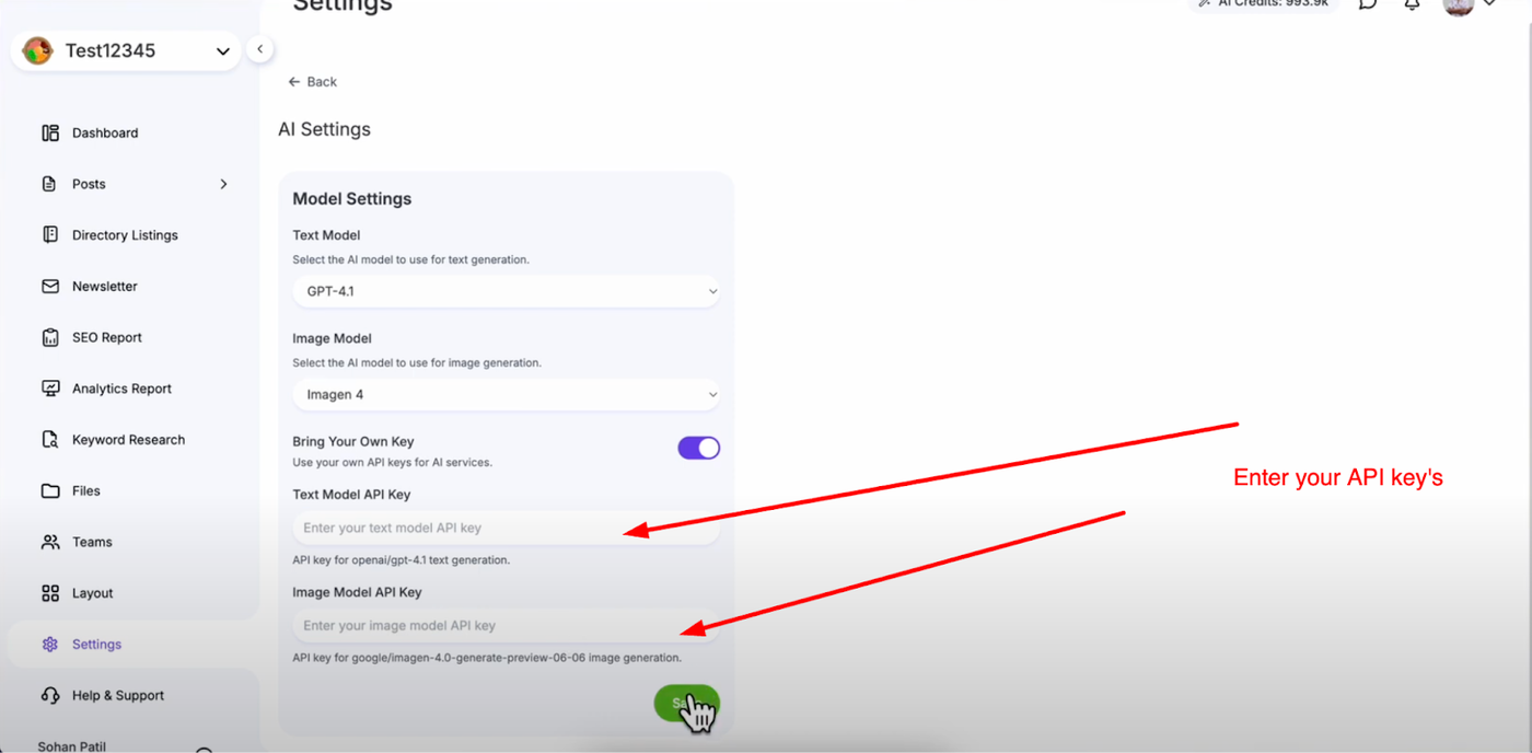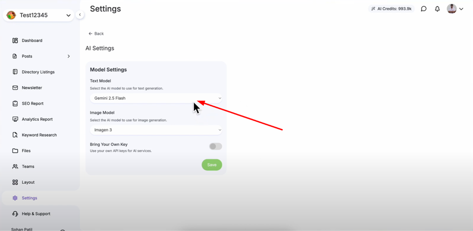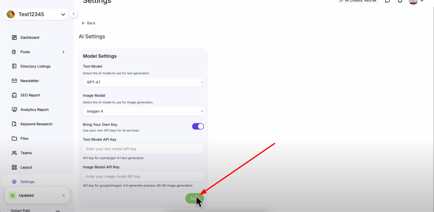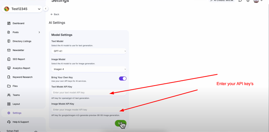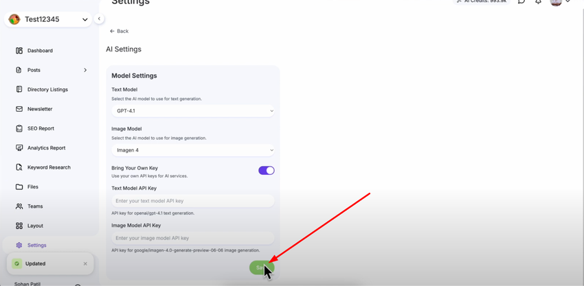 Click "Save" to complete the setup and activate your new AI model configuration. You now have full control over your AI models and can switch between providers or use your own keys for unlimited AI usage with your preferred providers.