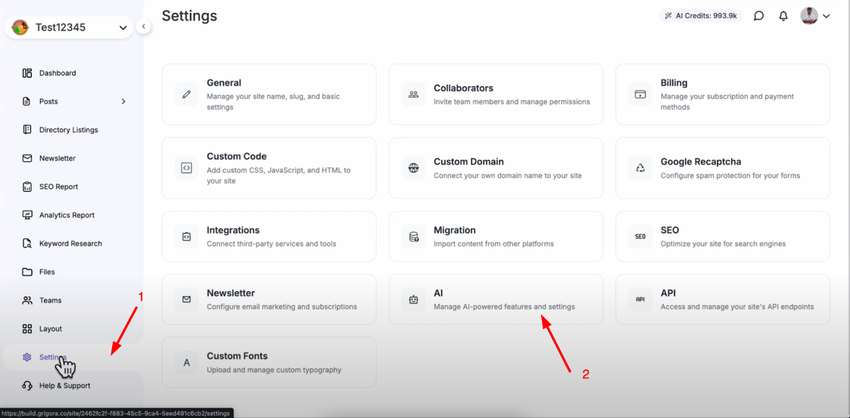 Navigate to your Grigora dashboard and click on "Settings" in the sidebar. Go to the AI section within settings where you'll find all the AI model configuration options.
