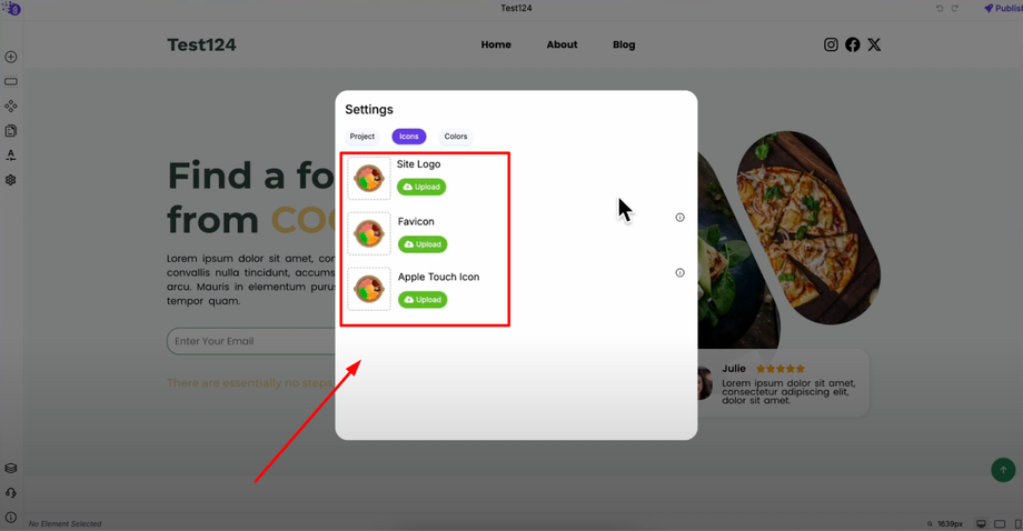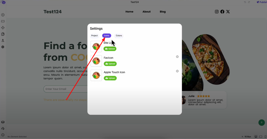Once in settings, navigate to the second tab labeled "Icons". This is where you can manage all your site's visual identity elements and upload the icons that will represent your brand across different platforms and devices.