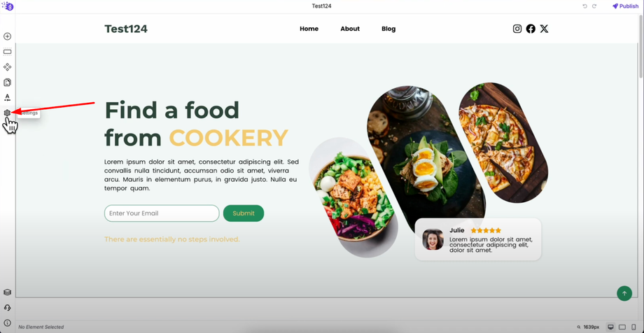 Open the Grigora editor and look at the left panel. Click on the settings icon to access your site settings where you can manage various aspects of your website's configuration and branding.