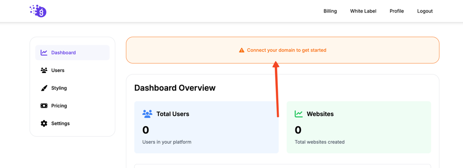 The platform will prompt you to connect your custom domain before you can proceed with other white label configurations.