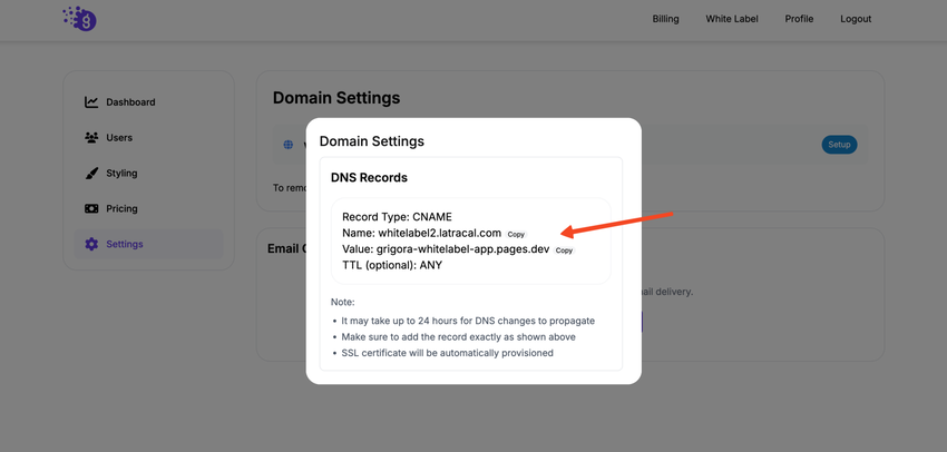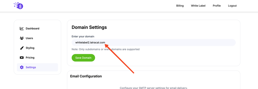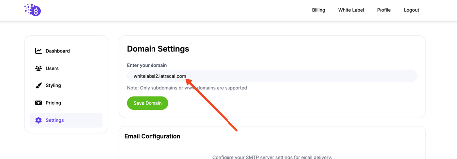 In the provided field, enter the exact domain name you wish to use for your white-labeled platform.