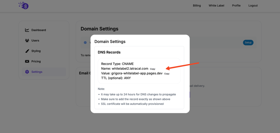 After entering your domain name, Grigora will provide you with the necessary DNS records to add to your domain registrar.