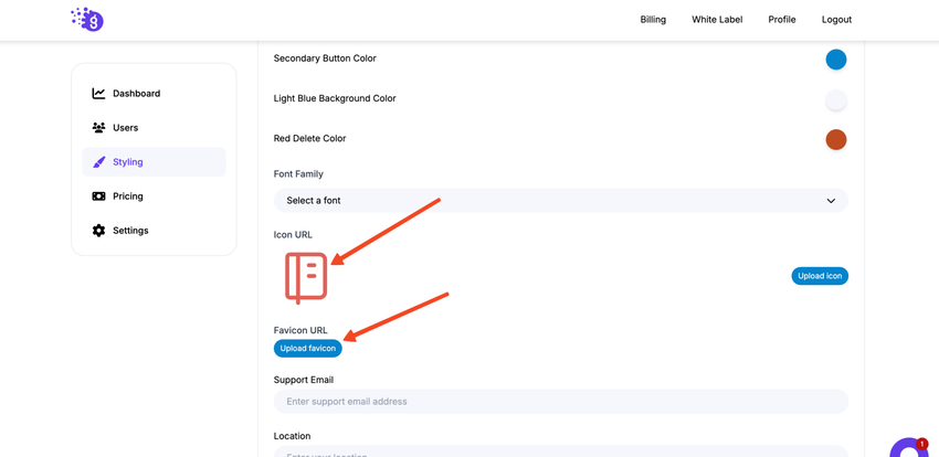In the styling section, you'll find various fields to replace Grigora's branding with your own. Fill in the following details: