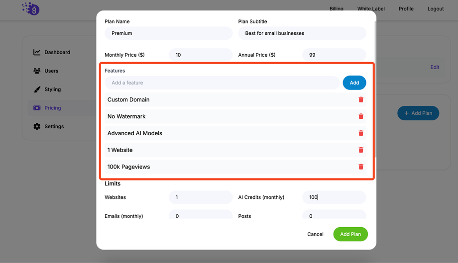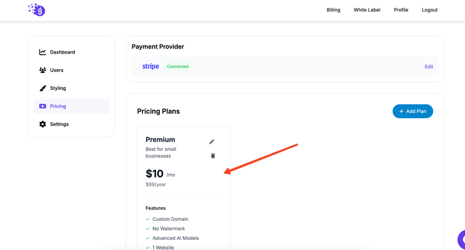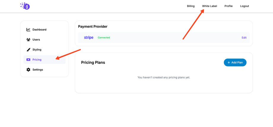 Once your Stripe payment gateway is connected, you can create customized pricing plans for your white-labeled platform. These plans will be presented to your customers, allowing them to sign up and pay for your services.