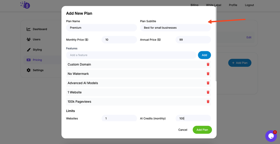 After saving, your new plan will be live on your white-labeled platform, and customers can begin subscribing. You can add multiple plans to offer a tiered pricing structure that suits different customer needs.